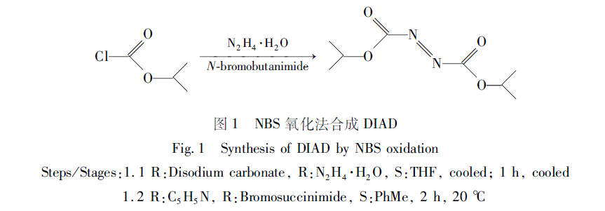 综上所述,DIAD合成方法是通常是氯甲酸异丙酯和水合肼反应合成肼1,2二甲酸二异丙酯,再用浓硝酸、氯气、溴素、NBS等氧化剂氧化而得。浓硝酸为氧化剂,在0℃以下氧化,产生大量的氮氧化物,氮能引起水环境的富营养化,环境污染严重。文献直接用氧化剂NBS在吡啶环境中氧化肼酯得到产品DIAD,产率高达90%以上,但由于溴素在水中溶解度不大,容易挥发造成大气污染,安全性差,且成本较高。代表反应路线见图1。